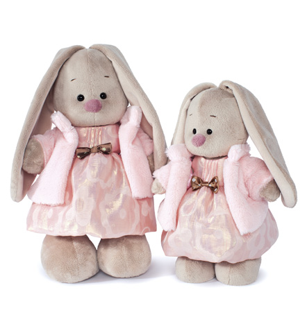 Меховая шубка цвета клубники со сливками на подкладе из нежно-розового атласа. В комплекте - нарядное платье с пышной юбочкой-баллон цвета розового жемчуга. Платье сшито из переливающегося жаккардового хлопка. Спереди украшено застроченными складочками и милым атласным бантиком кофейного цвета в бежевый горошек.
