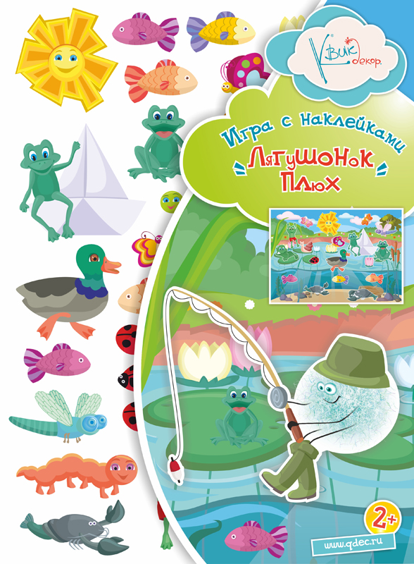Лягушонок Плюх и его друзья приглашают нас в гости на свое уютное озеро. Улыбается теплое солнышко, в прозрачной водичке растут водоросли, камыш и цветут кувшинки. Кто-кто у нас тут живет? Посмотрим вместе, покажем пальчиком и начнем приклеивать! В воде плавают цветные рыбки, на дне затаились раки между камнями и корягами. Уточки и лягушки умеют плавать и нырять. Бабочки и стрекозы летают над озером. А сколько у нас всего веселых лягушат? Они отдыхают на листьях кувшинок и катаются в бумажном кораблике. А самый главный - конечно, Плюх в забавных красных штанишках! У него такое смешное имя, потому что он больше всех прыгает в воду - и раздается громкий плюх!