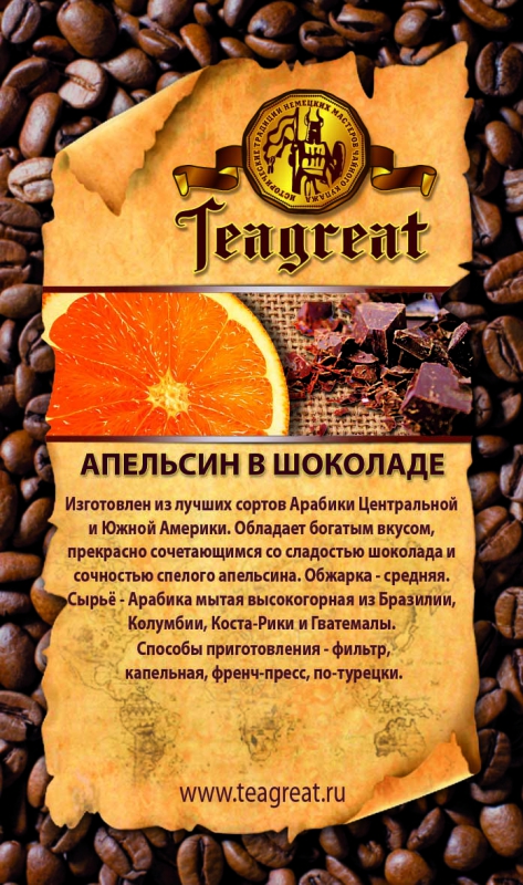 Апельсин в шоколаде. Изготовлен из лучших сортов Арабики Центральной и Южной Америки. Обладает богатым вкусом, прекрасно сочетающимся со сладостью шоколада и сочностью спелого апельсина. Обжарка - средняя.