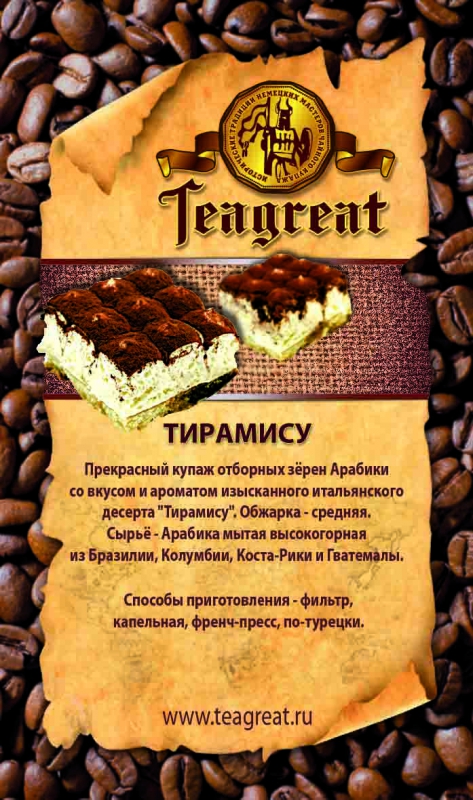 Тирамису. Прекрасный купаж отборных зерен Арабики со вкусом и ароматом изысканного итальянского десерта "Тирамису". Обжарка - средняя.