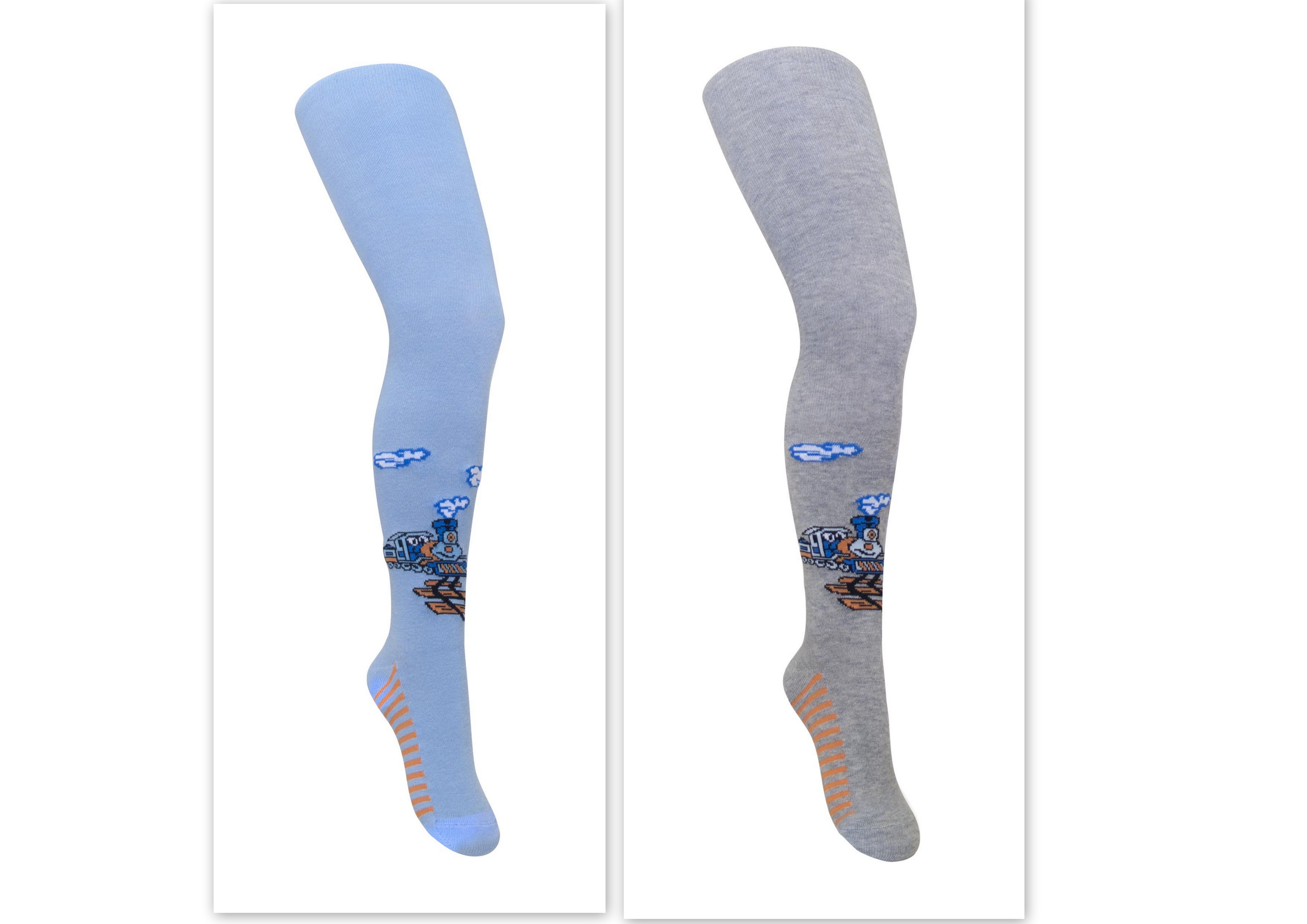 Описание: На паголенке спереди вывязан паровоз, по следу вывязаны цветные полоски