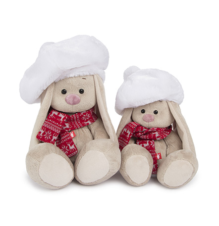 Зайка Ми в объёмном белоснежном берете из сверкающего меха с помпоном. Также на Зайке оригинальный шарфик из красного с принтом и серебристым люрексом трикотажа.