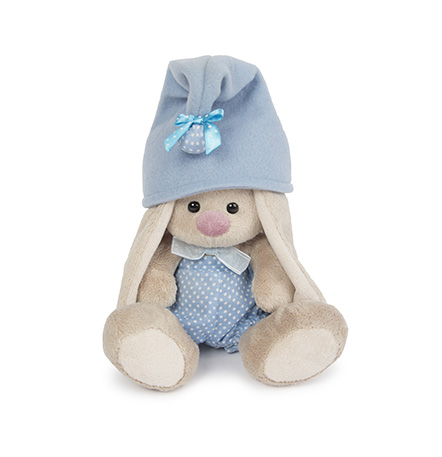 Зайка в голубых х/б панталончиках в горошек и голубом колпачке из флиса с х/б помпоном. Ещё на Зайке голубой бантик из органзы.