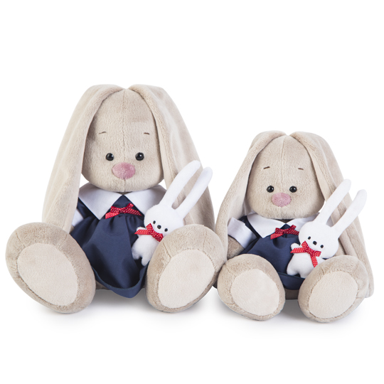 Зайка в строгом платье плотного сапфирового цвета с белым объёмным воротником и белыми манжетами. Спереди платье украшено алым бантиком в белый горошек из атласной ленты. В лапках Зайка держит игрушку - беленького зайчика с алым бантиком.