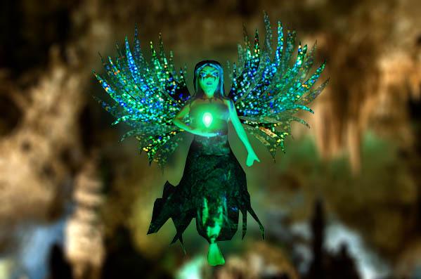 Она одета в темно-фиолетовое платье и держит в руках волшебный светящийся камень. У нее фиолетовые волосы с серебристыми локонами и на ее лице загадочный рисунок.