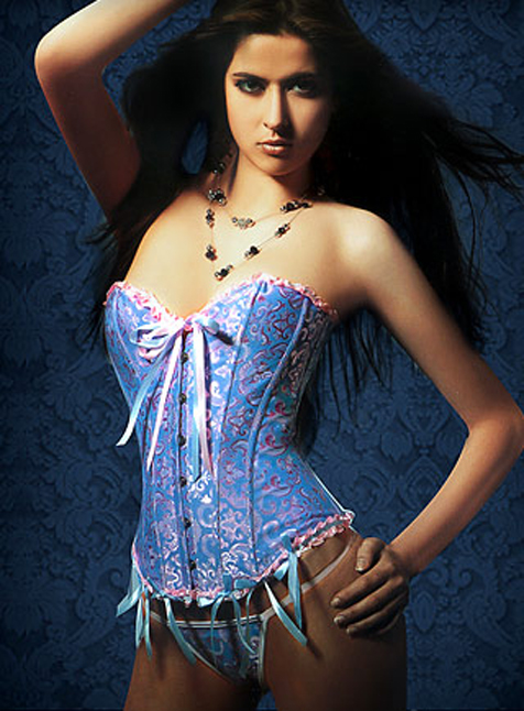 A819-BLU - это корсет голубого цвета и трусики-стринги. Спереди имеется удобная стальная застежка на жестком каркасе - бюск, позволяющая быстро одеть корсет. Корсет по фигуре затягивается на спине шнуровкой, утягивает в объеме около 5-7 см. Плотный жаккард с узором розового цвета украшен розовыми рюшами, в верхней и нижней части корсета есть небольшие розовые и голубые бантики. Пластиковые косточки позволяют с комфортом носить корсет 8-10 часов. Эластичный пластик, использующийся в корсете, не ломается и не деформируется.