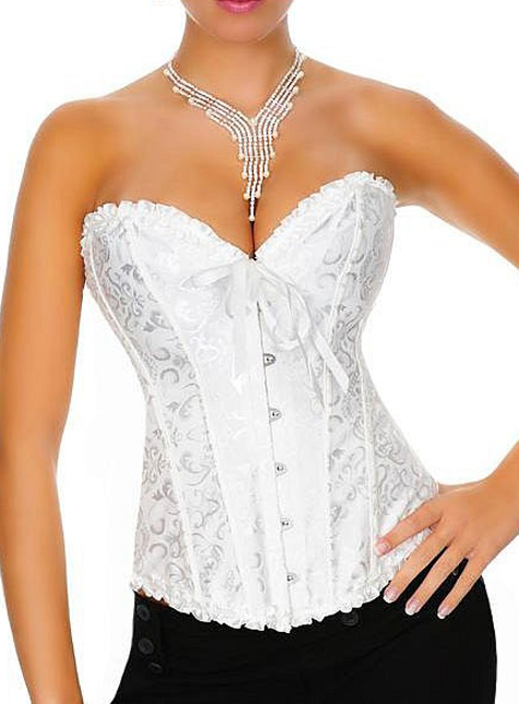 К корсету белого цвета A819-WHT прилагаются трусики-стринги в тон корсета. Корсет выполнен из плотного жаккарда с узором, утяжка около 5-7 см. Спереди металлическая застежка на жестком каркасе - бюск, на спине имеется шнуровкас тканевой подложкой, которая позволяет затянуть корсет по фигуре, спина при этом остается прикрыта подложкой. Косточки пластиковые, за счет эластичности они не подвержены изломам.