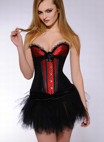 Корсет MH53-RED - утягивающий комбинированный корсет из черного атласа с чашечками с вставкой красного цвета с черными вкраплениями. В комплекте имеются трусики-стринги. Верх лифа украшен кружевами, прикреплен небольшой бант черного цвета.