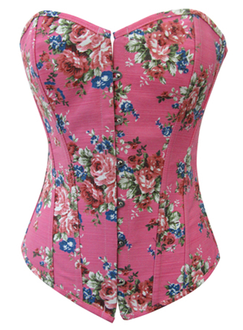 Корсет MH61-PNK имеет трусики-стринги в комплекте. На спине расположена шнуровка с подложкой из ткани в тон корсета, обычно спина под шнуровкой закрыта, но подложку можно прятать под корсет, оставляя спину открытой. Ткань корсета - плотный деним с цветочным узором. За счет плотности ткани достигается утяжка 5-7 см, косточки корсета выполнены из эластичного пластика, устойчивого к изломам и деформации. Застегивается корсет на металлический бюск, утягивающий живот.