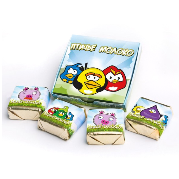 В коробочке 4 конфеты по 12 грамм с изображениями птиц и свиней.