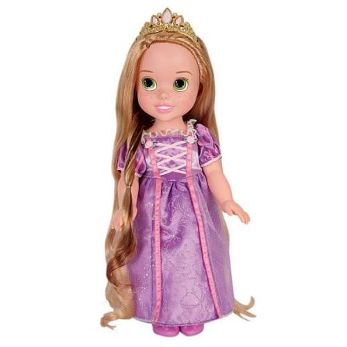 Малышка Рапунцель одета в очаровательное платьице, украшенное ленточками и рюшками. На ножках литые сиреневые туфельки. Роскошные волосы Рапунцель украшены сверкающей диадемой.