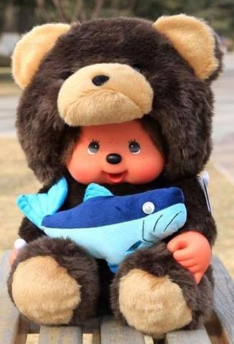 Обезьянка Monchhichi в маскарадном костюме мишки-рыболова с пойманной рыбкой. Высота игрушки - 50см.