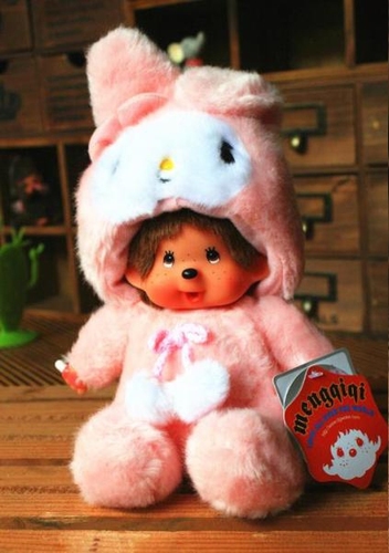 Обезьянка Monchhichi в маскарадном костюме розового кролика. Высота игрушки - 20см.
