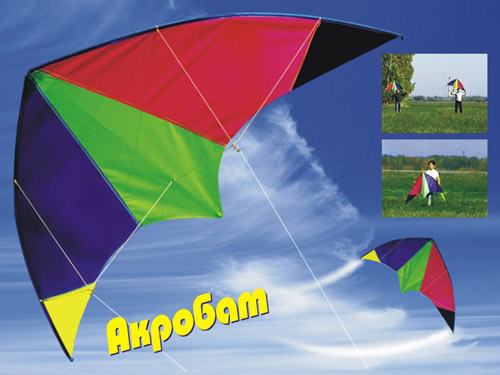 Простой управляемый воздушный змей. Размер 150х70см., 2 леера по 30м. Материал - армированный нейлон таффета R/S. Каркас из стеклопластикового стержня. Рассчитан на ветер от 7 до 14 м/сек.
