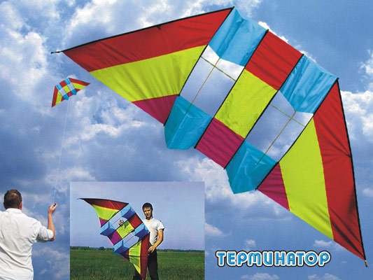 Коробчатый воздушный змей. Размер 200х70см., длина леера 50м. Материал - армированный нейлон таффетаR/S. Каркас из стеклопластикового стержня. Рассчитан на ветер от 3 до 14 м/сек.