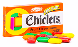 Название этой жевательной резинки родилось, благодаря вечно зеленому дереву Manilkara chicle, из сока которого в 1869 году Томас Адамс начал производить жевательную резинку. Само слово chicle пришло к нам из древнего мексиканского языка Nahuatl. Оно переводится, как «липкий», «тягучий». Что касается самой жевательной резинки, то в каждой пачке, выполненной в ретро стиле, Вы найдете подушечки четырех различных цветов, которые соответствуют разным фруктовым вкусам: лимон, яблоко, клубника, банан.