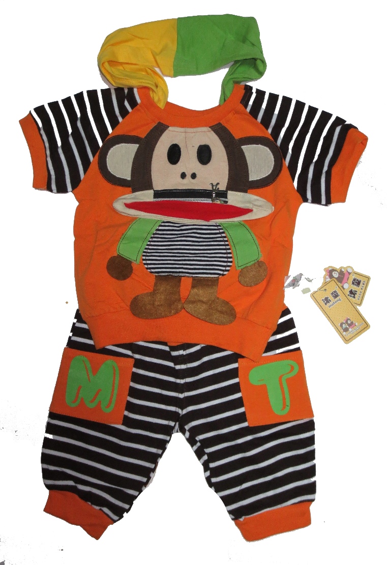 На штанах четыре кармашка (2 спереди и два сзади), есть полукапюшон, в мордочке обезьянки - кармашек на замочке.